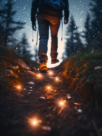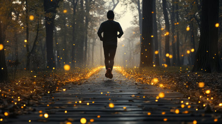strong immunity concept. Silhouette of a man jogging down a misty forest trail with glowing lights on a moody autumn evening, evoking magic and inspiration.