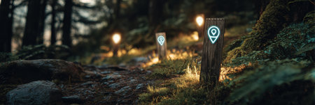 A peaceful forest trail illuminated by glowing map pin icons, guiding hikers through lush greenery at dusk, creating a sense of adventure and exploration.