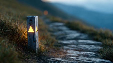 Glowing trail marker stands tall along the mountain path at dusk, providing direction to hikers exploring the rugged terrain and breathtaking views.