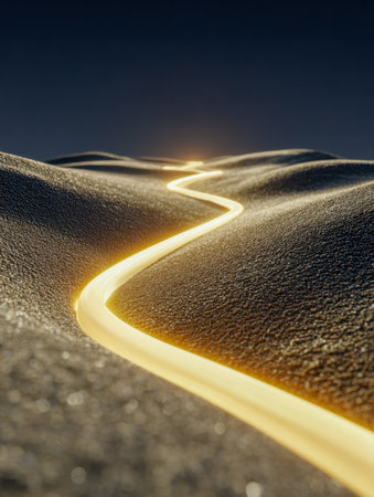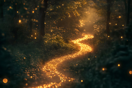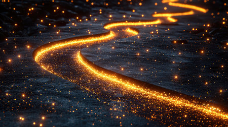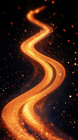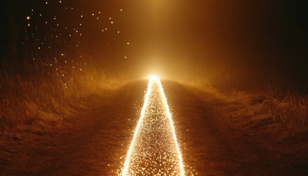 This image features a glowing golden pathway winding through darkness, adorned with sparkling particles, creating an enchanting atmosphere filled with warmth.