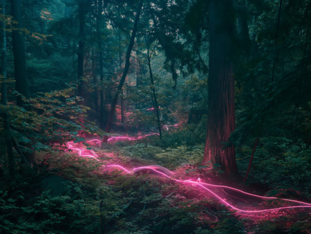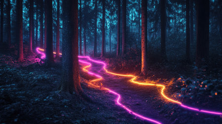 A captivating forest scene featuring luminous neon lights tracing a winding path through tall trees, creating a magical atmosphere during twilight. Perfect for imaginative themes.