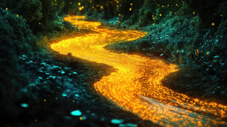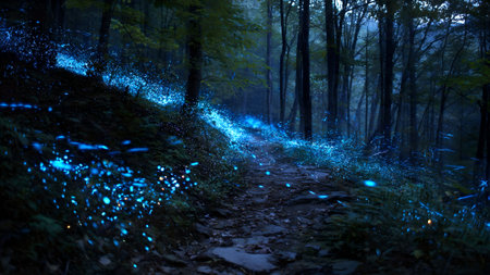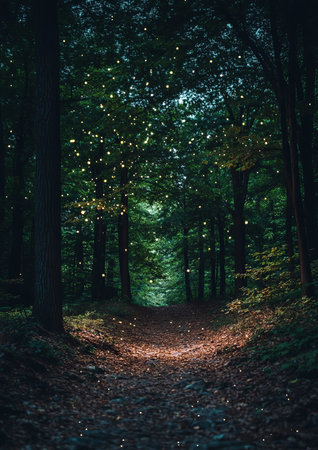 Magical forest path illuminated by glowing fireflies Creating using generative AI tools