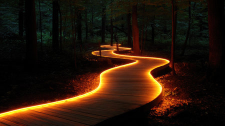 Winding wooden pathway in a dark forest is highlighted by a line of warm orange LED lights. The pathway curves through the trees, creating a serene and beautiful scene at night.