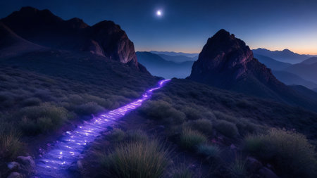 A luminous trail weaves through rugged hills beneath a night sky, evoking a visionary voyage into the unknown future and endless possibilities ahead.