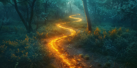 A winding pathway through a misty forest, illuminated by sparkling lights, creating a magical and enchanting atmosphere ideal for exploring nature's serene beauty.
