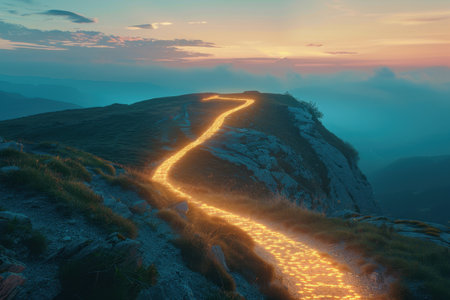 A glowing golden path winds through misty landscape, symbolizing success, winner, and victory, evoking sense of hope and inspiration