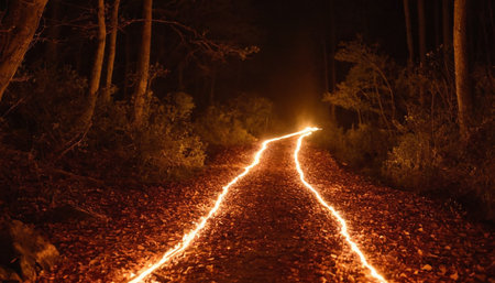 A mystical woodland trail bathed in soft glow from shimmering fireflies and twinkling light streaks, evoking magical nighttime serenity.
