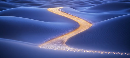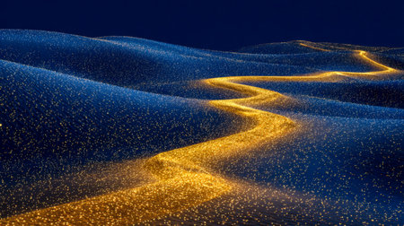 A radiant gold trail snakes through a luminous navy-blue terrain dotted with twinkling lights, resembling gentle hills under a mesmerizing night canopy filled with shimme