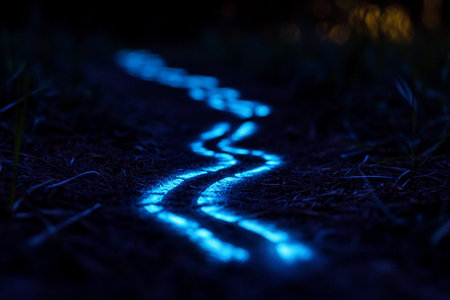 Luminescent teal lights trace a sinuous path, creating a magical effect through a dark, lush forest. Soft glows and blurred edges add to the ethereal atmosphere.