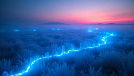 An illuminated path curves over water, connecting two cliffs under a twilight sky. The scene features vibrant orange and blue tones, with a focus on lighting. This abstract digital art can be used for promotional material, website backgrounds, or conceptual imagery for editorial purposes.