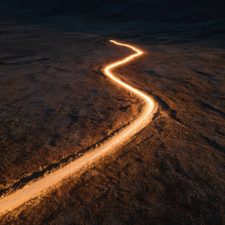 An image captures a dark road illuminated by a series of glowing lights, creating a winding path. The golden hue of the lights contrasts with the dark asphalt and the dusky sky. The composition suggests motion and direction, possibly suitable for promotional materials or editorial content.