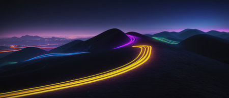 Winding road at night, illuminated by streaks of vehicle lights, surrounded by dark hills and mountains, creating a serene yet dynamic atmosphere of movement, AI generated