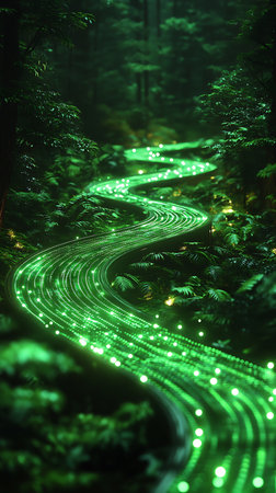 A captivating image showcasing a vibrant green stream illuminated with glowing orbs, winding through a densely forested area, highlighting the fusion of nature and light.