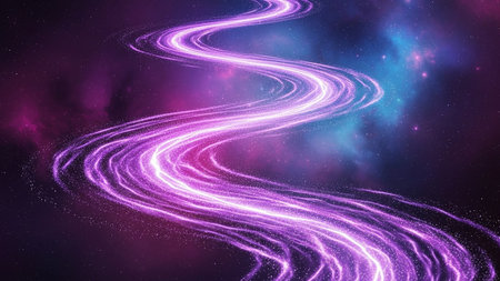 A vibrant, glowing river of purple light winds its way through a deep space background filled with stars and colorful nebulae. The light stream is composed of countless tiny sparkling particles, creating a sense of dynamic motion and ethereal energy. The background swirling clouds of pink and blue cosmic dust, with distant stars and galaxies adding depth and a sense of immense scale. The overall impression is one of a magical, cosmic journey or a powerful, luminous energy flow.