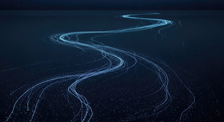 Glowing blue light trails illuminate a dark, reflective surface, creating a dynamic visual representation of data flow and interconnected digital pathways. This image conveys concepts of technology, communication, and modern innovation.