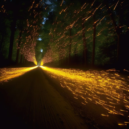 Vibrant car light trails create a pathway of magical possibilities beckoning those who dare to venture into the depths of the forest