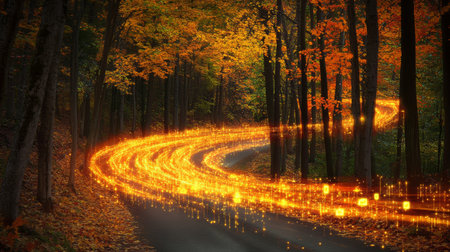Golden Data Stream Flowing Through Autumn Forest Road, Symbolizing Cyber Communication Speed