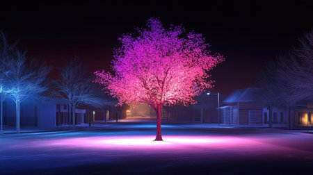 A striking pink tree stands illuminated in a serene snowy street, surrounded by soft glowing lights, creating an enchanting winter nighttime scene.