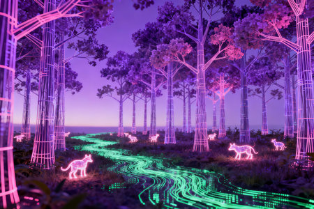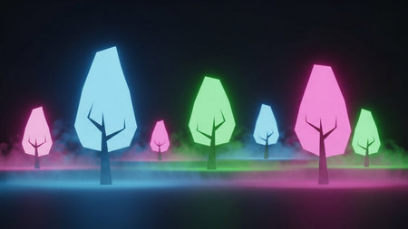 An AI generated illustration of a picturesque forest illuminated by vibrant neon colors in the night