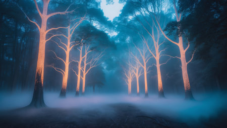 Ethereal forest pathway illuminated by glowing trees and enveloped in mist during twilight hours