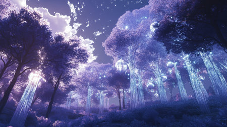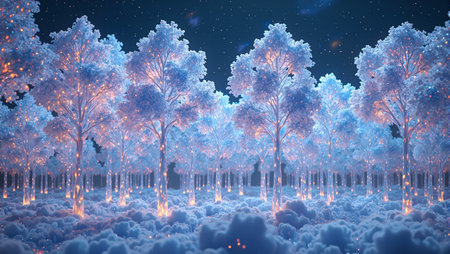 Enchanting forest of glass like trees amid twilight sky with swirling stars
