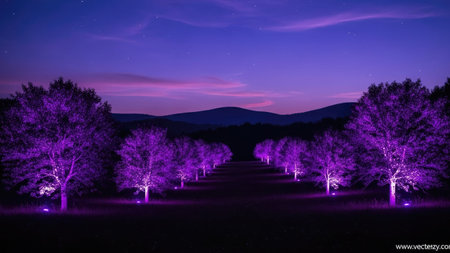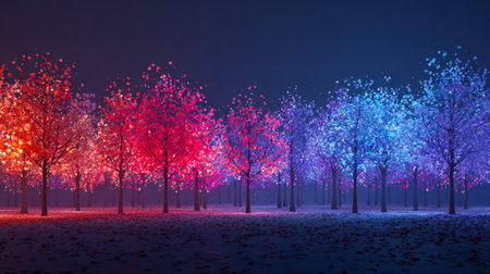 A stunning display of colorful illuminated trees brightens up a serene winter landscape at night, creating a magical and tranquil atmosphere in nature.