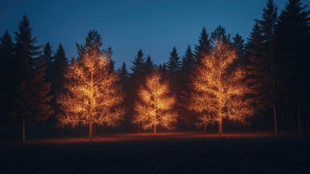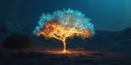 Brightly lit tree glows against a dark sky, casting a warm aura in a serene natural setting.