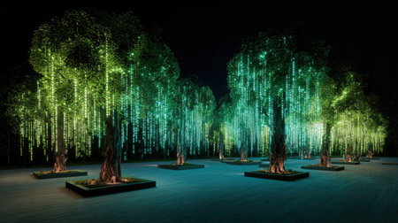 This stunning image features an enchanted forest with striking trees illuminated by green and blue lights. The serene setting offers a whimsical escape into nature's beauty.