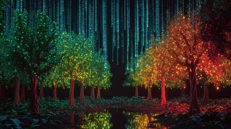 A mesmerizing scene of an enchanted forest filled with colorful illuminated trees and glowing lights, reflecting beautifully in the calm waters below.
