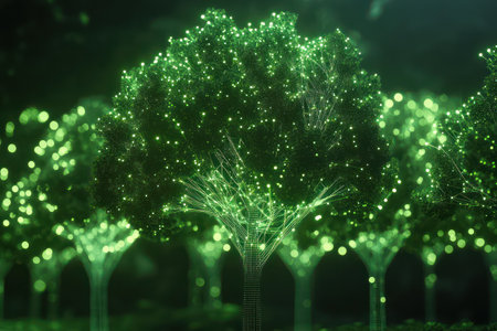 Futuristic visual of green tech trees forming from network lines, symbolizing eco-innovation, Arbor Day, and clean technology.