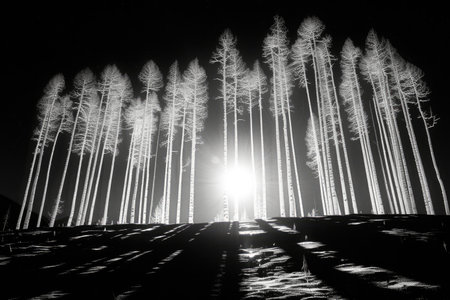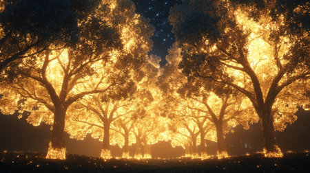 An evocative image captures a forest at twilight, illuminated by vibrant, fiery light that outlines the tall trees. The composition focuses on the interplay of light and shadow, highlighting textures and shapes within the natural environment. The scene may be used for editorial purposes or creative projects.
