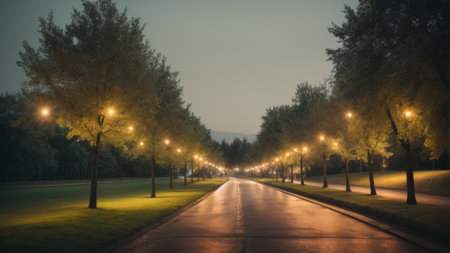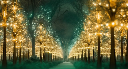 A pathway illuminated by strings of lights hanging from the trees, creating a captivating nighttime ambiance, Romantic tree alley underneath a starlit sky in a park, AI Generated
