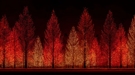 A mesmerizing autumn night scene featuring illuminated trees in vibrant red and orange hues, creating a magical and festive atmosphere perfect for seasonal celebrations.
