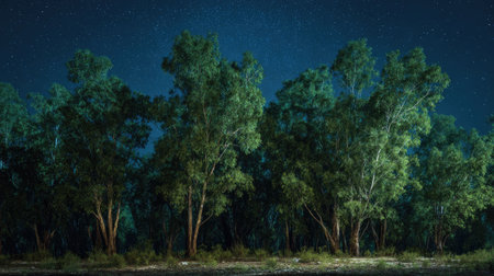 A panoramic wide view of Blue gum field growing closely together under a clear night sky starlight illuminating leaves soft shadows calm natural atmosphere ultra realistic photography cinematic wide composition lifelike natural scene