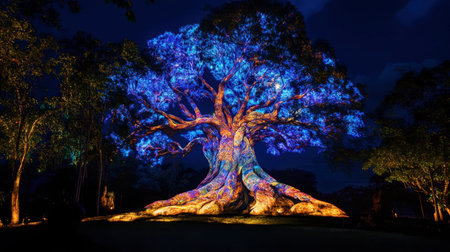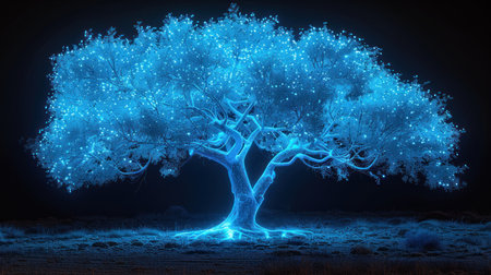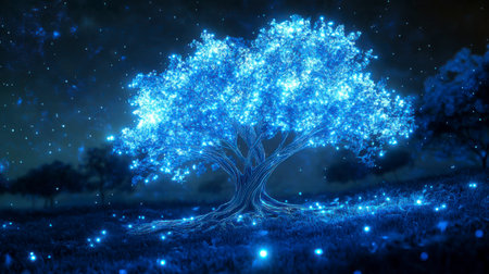 Glowing blue tree at night, digital art. Sparkling lights illuminate the tree and ground, creating a magical, ethereal atmosphere. Dark background with other trees visible in the distance.