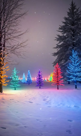 Magical winter wonderland with Christmas trees adorned in colorful lights at a festive location