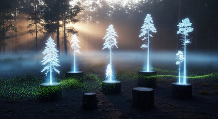 Surreal forest scene with glowing, holographic pine trees rising from cut tree stumps in a foggy landscape
