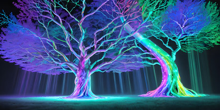 A luminous woodland scene at night featuring trees bathed in vivid, shifting colors, creating a magical, dreamlike atmosphere filled with vibrant energy.
