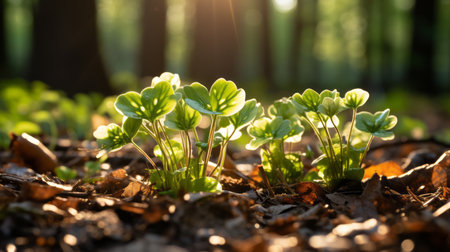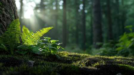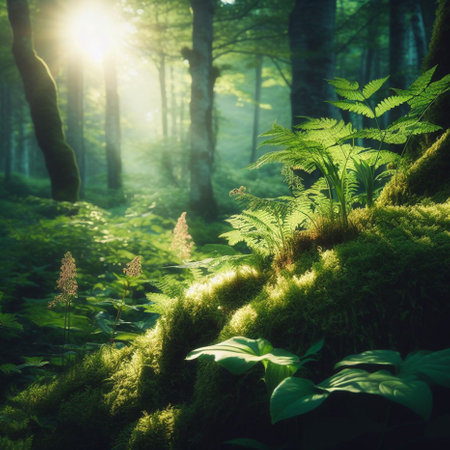 Sunbeams pierce a lush forest canopy, illuminating a vibrant carpet of green plants on the forest floor. Perfect for nature, ecology, or environmental themes, this image evokes feelings of serenity and tranquility. Ideal as a background, wallpaper, or texture, showcasing the beauty of spring or summer growth in a magical woodland setting.