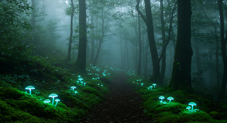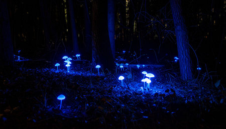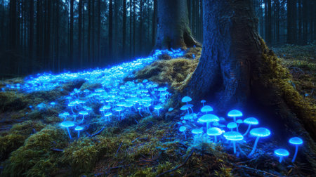 Bioluminescent mushrooms illuminate a dark forest landscape at night