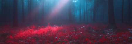 Scarlet rays illuminate a tranquil forest landscape at dusk