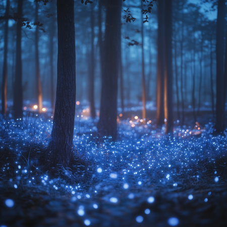 Enchanting Twilight Woodland An Atmospheric Surreal Landscape with Mysterious Glowing Trees and Moody Blue Tones