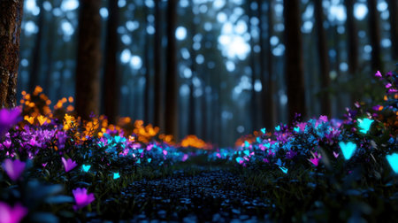 A stunning pathway through a lush forest illuminated by vibrant lights, creating a magical atmosphere filled with color and tranquility, perfect for exploration and adventure.