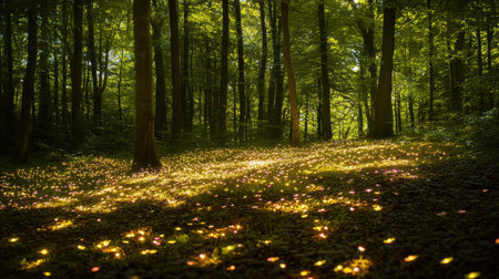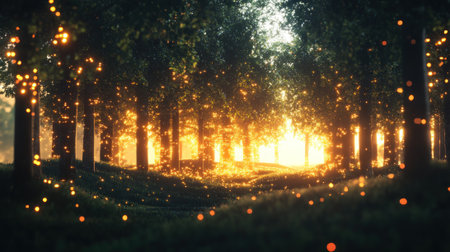 A tranquil forest filled with tall green trees and a carpet of glowing lights covering the ground, creating a magical atmosphere as the evening sets in.