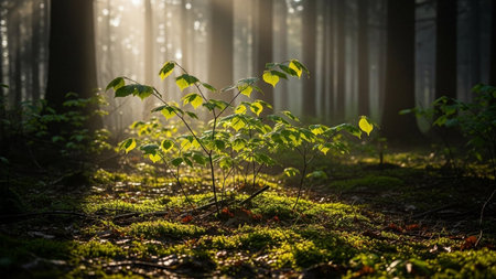 A small green plant is growing in the shade of a tree. Concept of tranquility and peace, as the plant is surrounded by the natural beauty of the forest