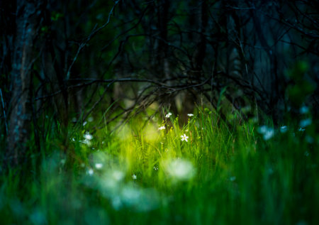 Creepy blurred background with ultra green grass from bottom or low angle view in light with blurry pine forest with copy space for text.