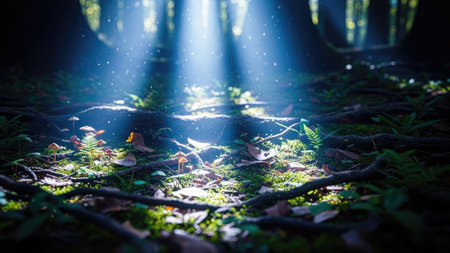 Sunbeams pierce a mystical forest, illuminating lush greenery. Peaceful nature.