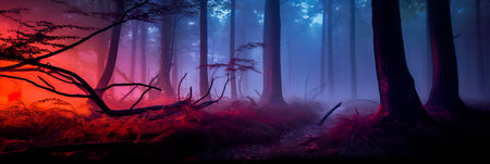 Glowing bioluminescent flowers in a dark, haunted forest generative ai