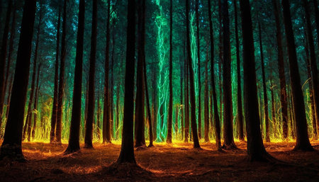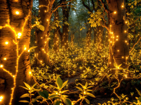 A magical forest scene at night with trees adorned with warm yellow lights illuminating the path and undergrowth creating a mystical ambiance A truly enchanting sight