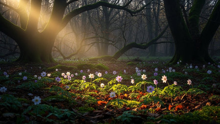 Golden sunbeams pierce through a dark forest canopy, illuminating a clearing filled with blooming white and purple...